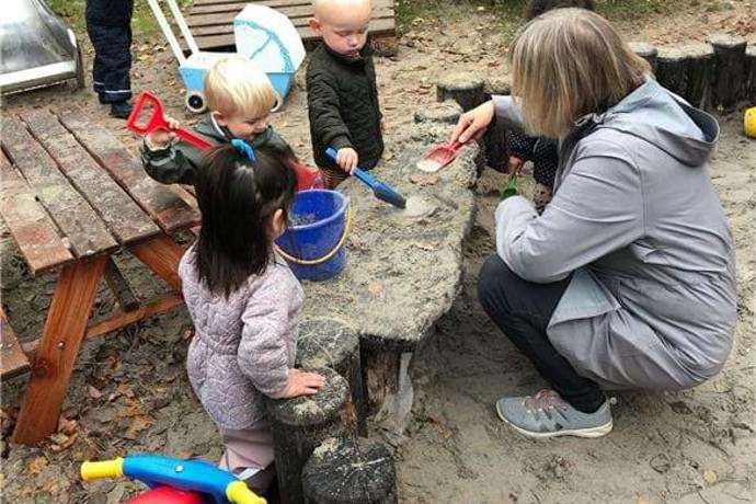Vi taler meget med børnene og benævner, hvad vi gør i forskellige situationer. Vi sørger for, at der er tid og rum i løbet af dagen til, at børnene kan bruge sproget, f.eks. ved måltiderne.