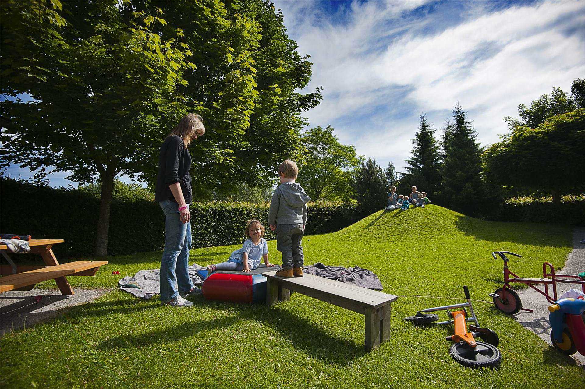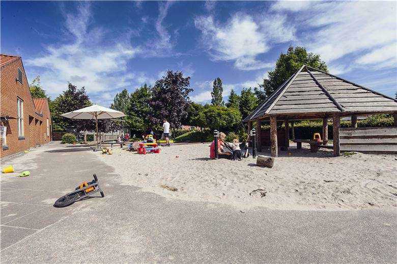 Børnene er fordelt ud på fire faste stuer, men udover de fire stuer indeholder vores hus også et fællesrum, et tumlerum og et krearum. Vi har en dejlig stor legeplads, som vi bruger hver eftermiddag og ofte også om formiddagen. Det er dejligt for børnene at komme ud i den friske luft, hvor der er andre oplevelser og god plads til at boltre sig på bakken, rutsjebanen, i ”skoven”, på cyklerne osv. Legepladsen giver også mulighed for ro og fordybelse. Barnet kan fx lave sandkager, grave efter regnorme, få en lang gyngetur med vennerne.